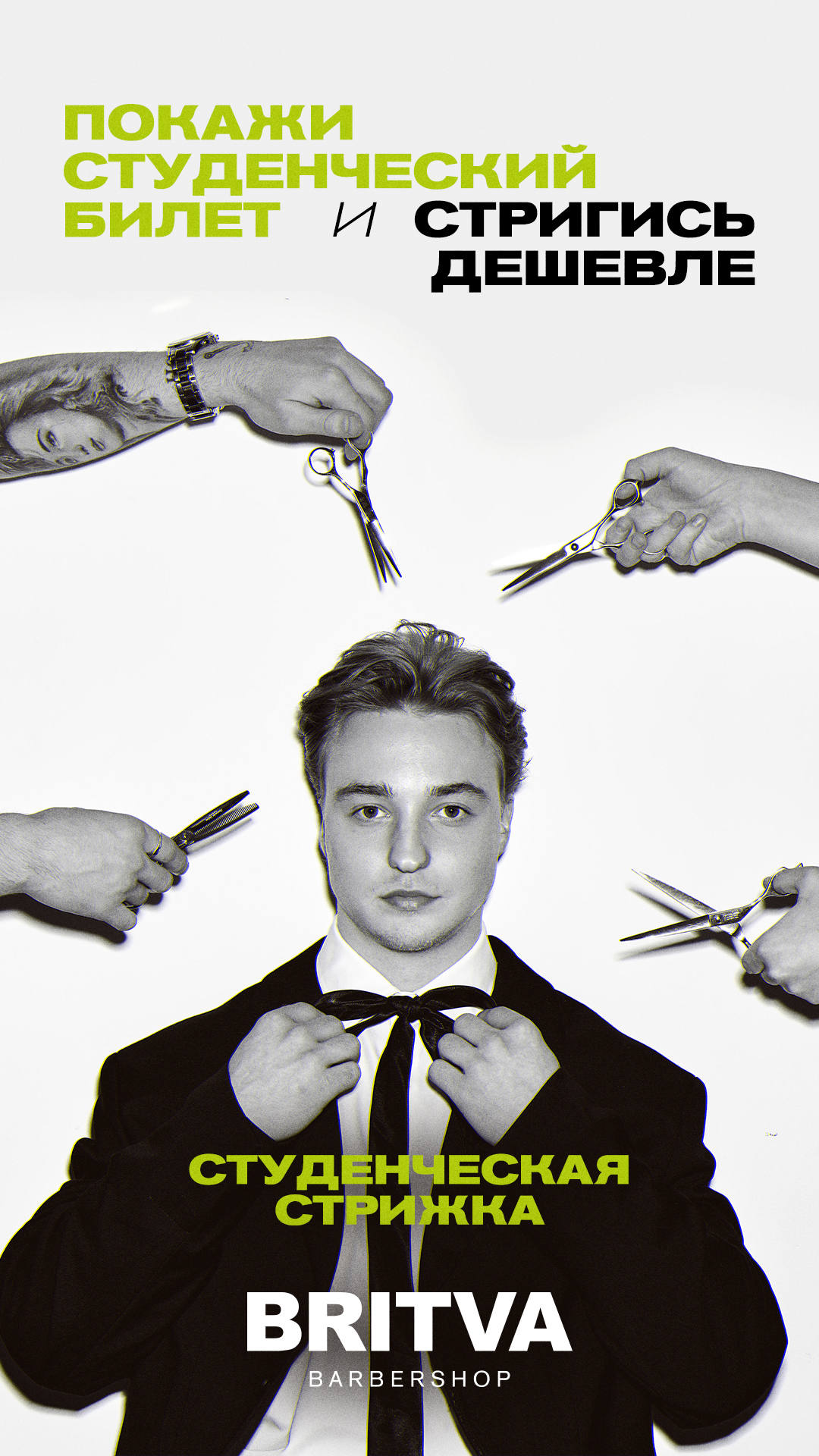 • студентам стрижка 1490 руб. (вместо 1690), 1990 руб. (вместо 2290) при записи к топ-барберу; 2500 руб. (вместо 2900) при записи к бренд-барберу с пн. по чт. с 12.00 по 18.00 при записи к барберу;