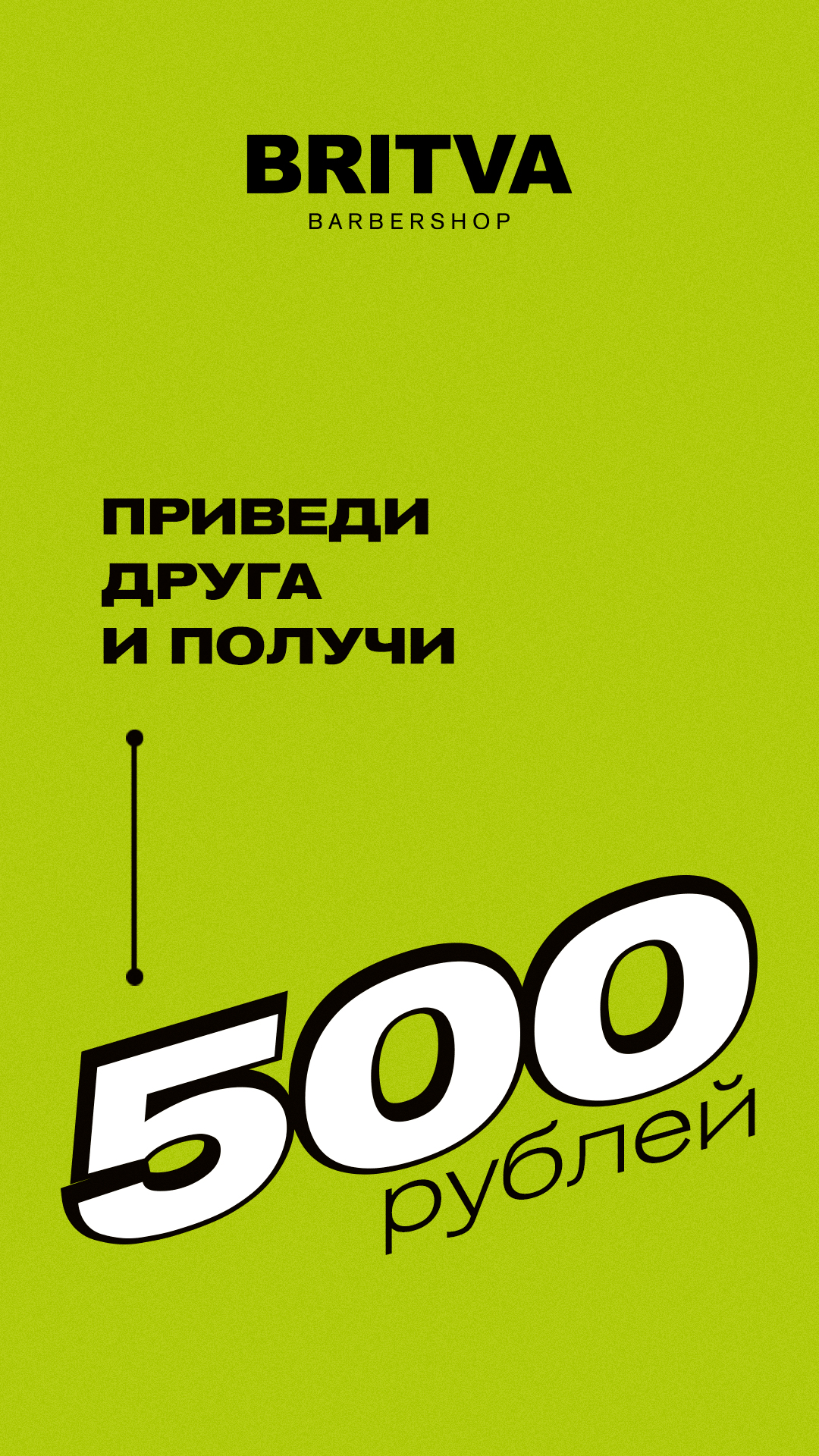 • когда твой друг воспользуется услугами в BRITVA, тогда каждому из вас будет начислена скидка 500 рублей, которой вы сможете воспользоваться при следующем посещении барбершопа (при покупке услуги от 1000 рублей);